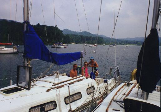 Here we are rafted up at Terry's mooring. The photo is taken from the bow of Upbeat. From left to right are Terry, Cindy, and Mary. |