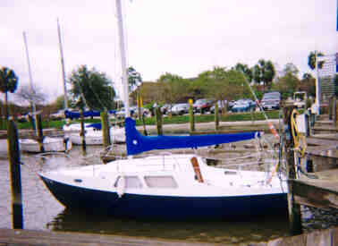 The South Coast 25 was designed by Warren Metcalf. Warren was killed in a tragic diving accident before he was able to finish the design. The SC 25 was built to compete with the popular Coronado 25. About 100 SC 25s were produced. Bob Boehmer writes: Our boat is a 1969 South Coast 25 with a fin keel. There is a V-berth at the bow with anchor chain storage at the very front. Moving aft, a bulkhead separates a (very cramped) head on the port and a closet on the starboard from the v-berth. Aft of this there is a table with two benches which drops down and converts to a (supposed) double berth on the port side. On the starboard is the galley: a sink, counter, and detachable two burner alcohol stove. Aft of this is the companionway. The cockpit is a bit longer than 6 feet. Tiller steering. We have a 15HP Mercury outboard mounted in the lazarette with remote controls (throttle and shifter) in the cockpit. Head room is not good for me. I'm 6'2" and have to stoop when I'm below although the boat is equipped with a pop-top. This is a nice feature as it _does_ allow me to stand up straight in that portion of the cabin. It also allows a nice breeze. She has a roller-furling genoa jib and one jiffy-reef on the mainsail (and lazy jacks). I am not sure what all was original. Some things I do know were added by the previous owner: roller-furling, jiffy reefing, remote controls, outboard. Based on the installation of the head, I would say that this was either standard or a factory option. The previous owner also raised the attachment point for the boom on the mast to provide additional headroom in the cockpit.